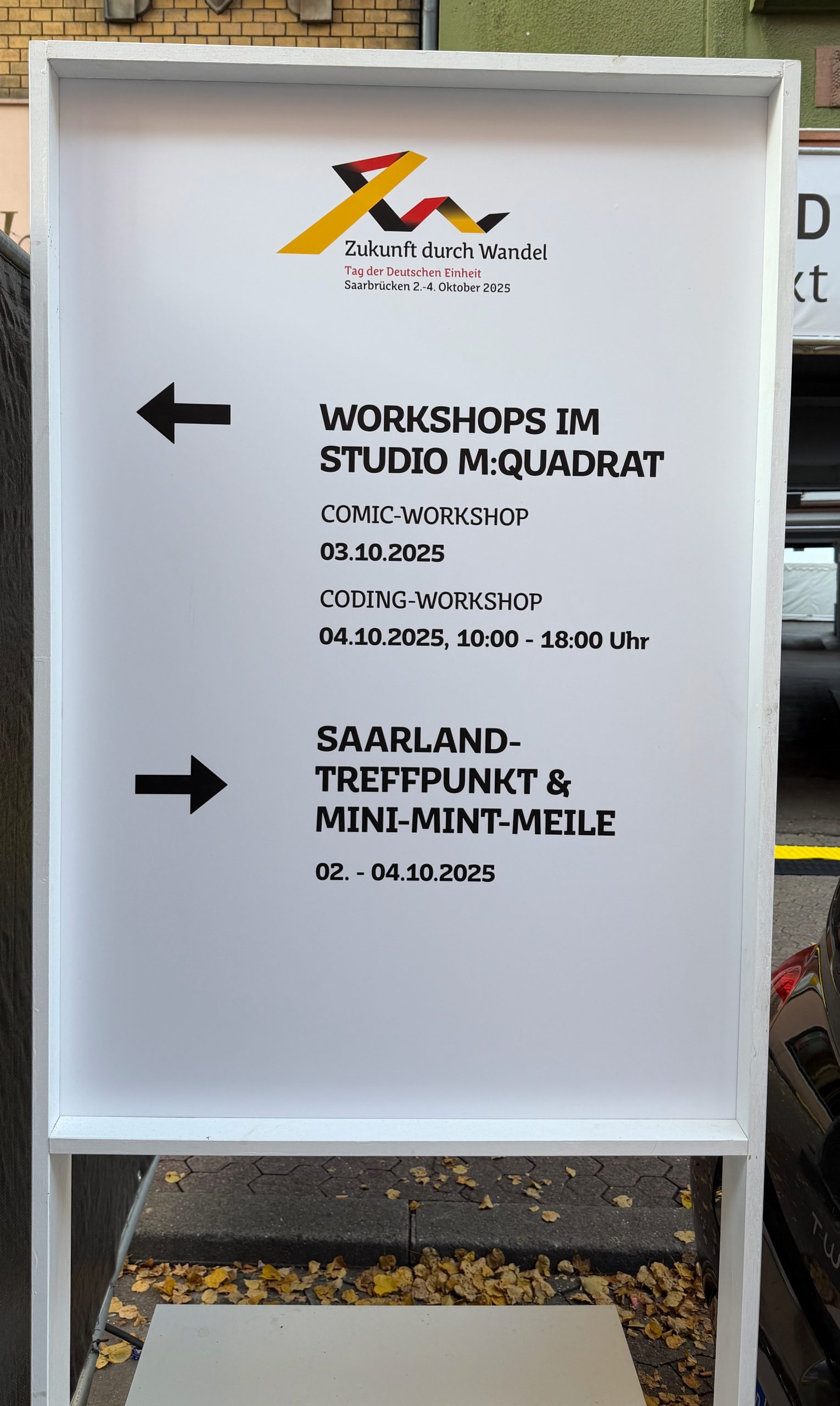 Im Oktober wird vom 2. – 04.10.2025 das Fest der deutschen Einheit in Saarbrücken gefeiert. Das Ministerium für Wirtschaft, Innovation, Digitales und Energie hat das Studio M:Quadrat in der Mainzerstraße gemietet. Am Samstag, den 04.10.2025, darf das CoderDojo Saar dort einen Coding-Workshop anzubieten.