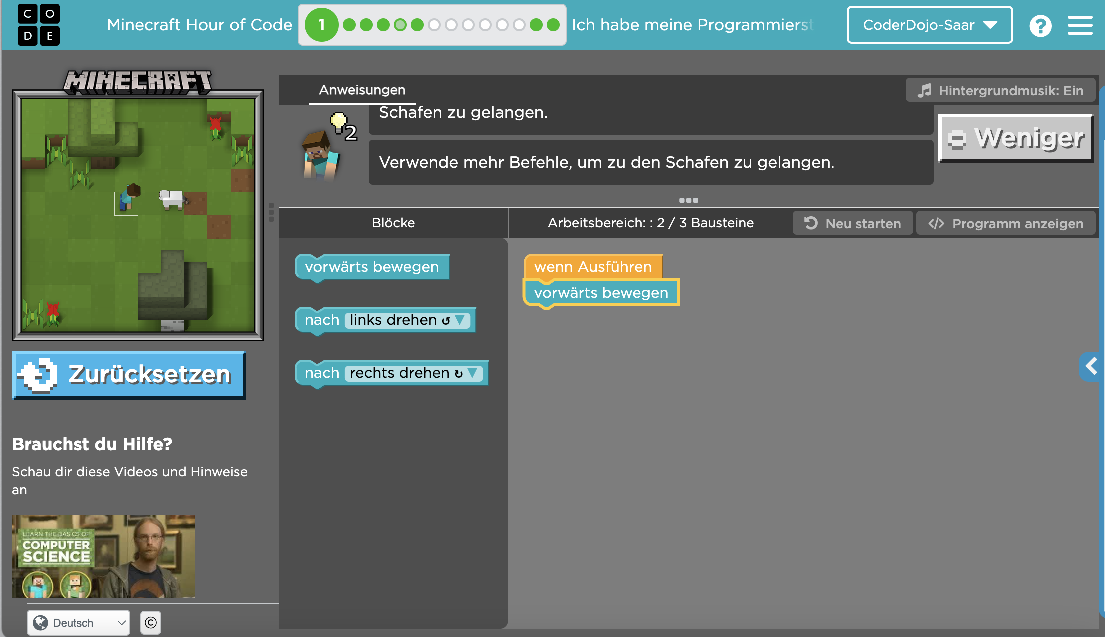 Angeboten wird vom CoderDojo die Teilnahme an der Minecraft-„Hour of Code“.